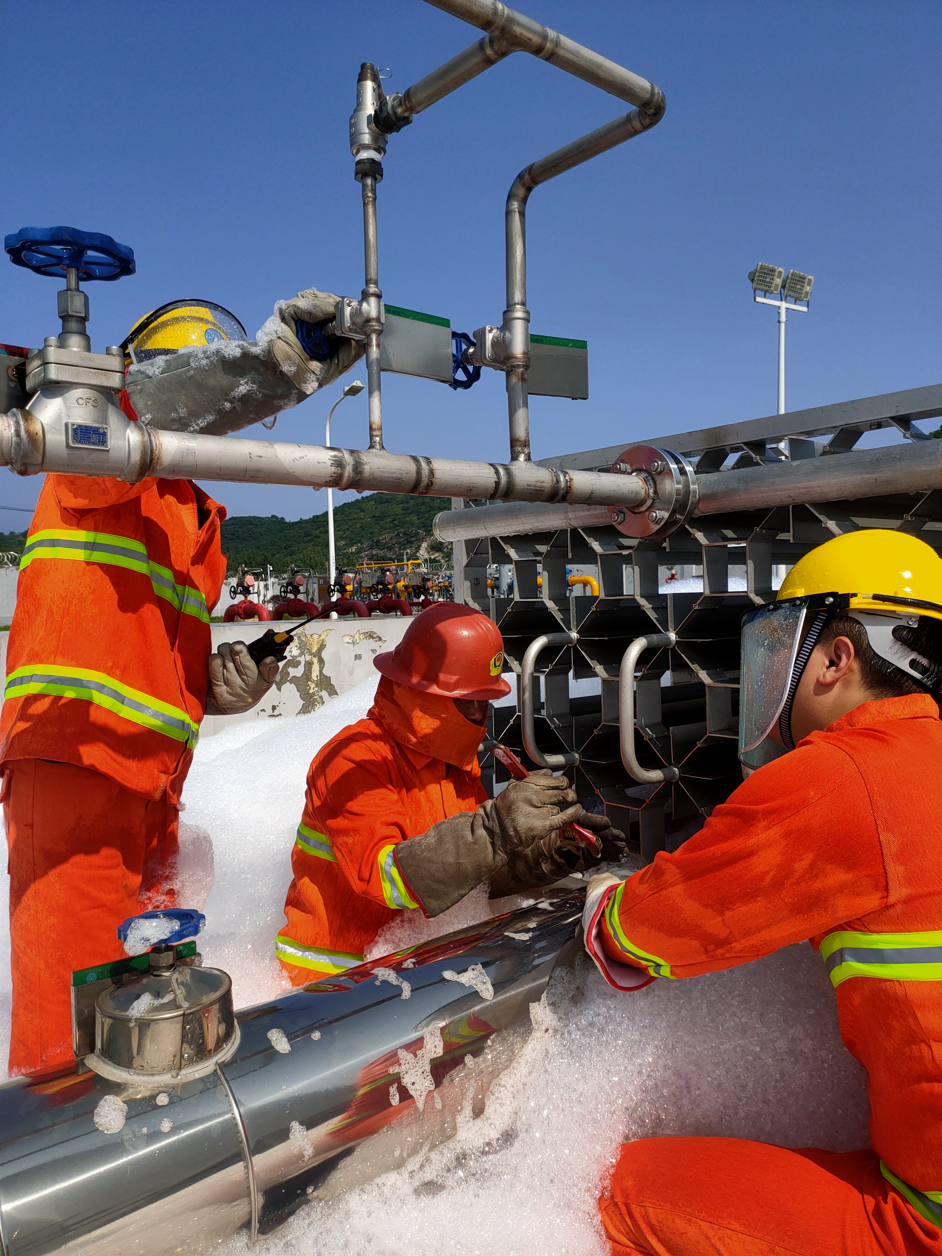 演練模擬了LNG站在氣化作業(yè)時(shí)出現(xiàn)儲罐增壓撬進(jìn)液法蘭泄漏,罐區(qū)低溫探測器報(bào)警,聯(lián)動(dòng)啟動(dòng)泡沫發(fā)生器,泡沫迅速覆蓋泄漏區(qū)域。站控室值守人員迅速上報(bào)并立刻按下PLC的ESD緊急按鍵切斷所有氣動(dòng)閥門,安保人員拉起警戒線負(fù)責(zé)警戒。在確認(rèn)現(xiàn)場情況和泄漏位置后,搶險(xiǎn)人員迅速穿戴搶險(xiǎn)裝備前往泄漏點(diǎn)開展緊急搶險(xiǎn)維修。演練歷時(shí)30分鐘,整個(gè)過程緊張有序、分工明確、處置得當(dāng)。