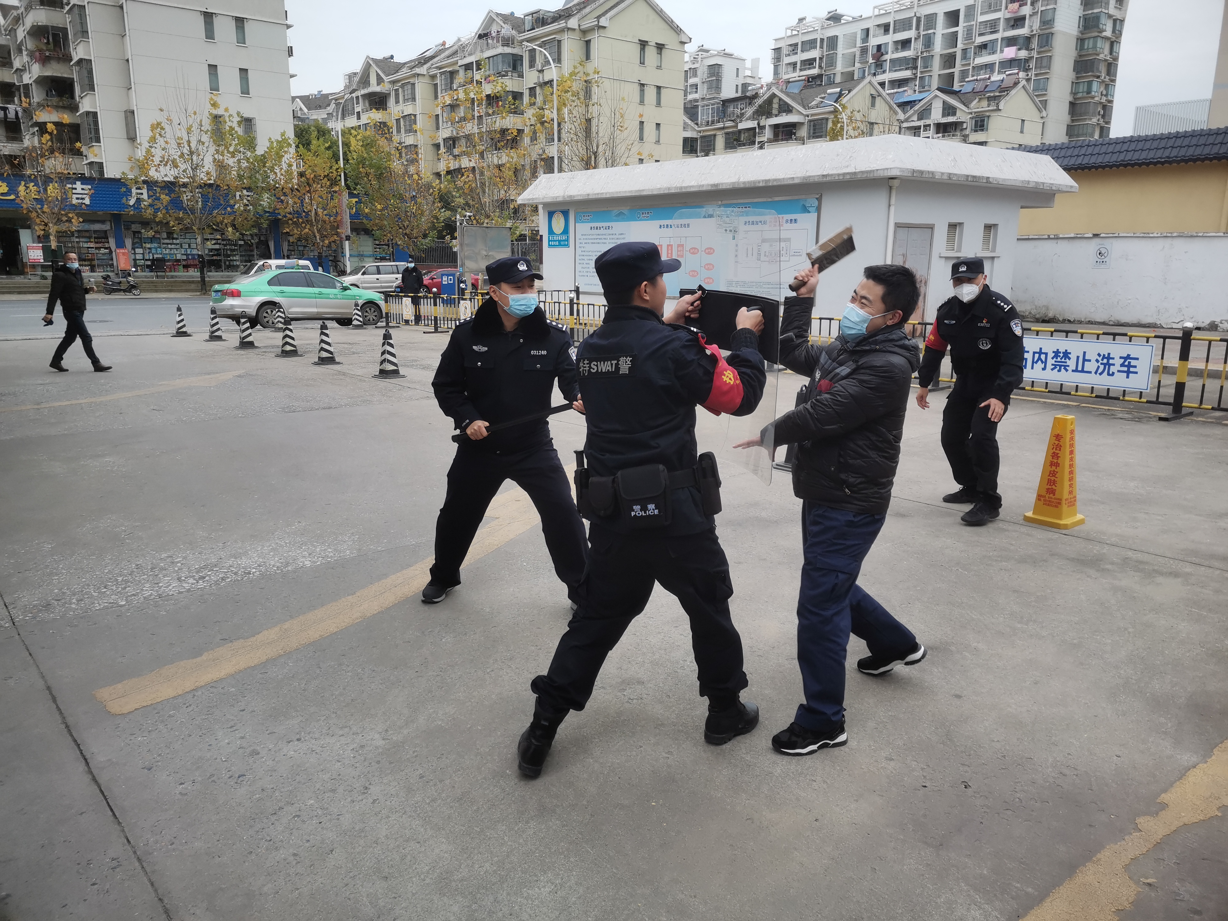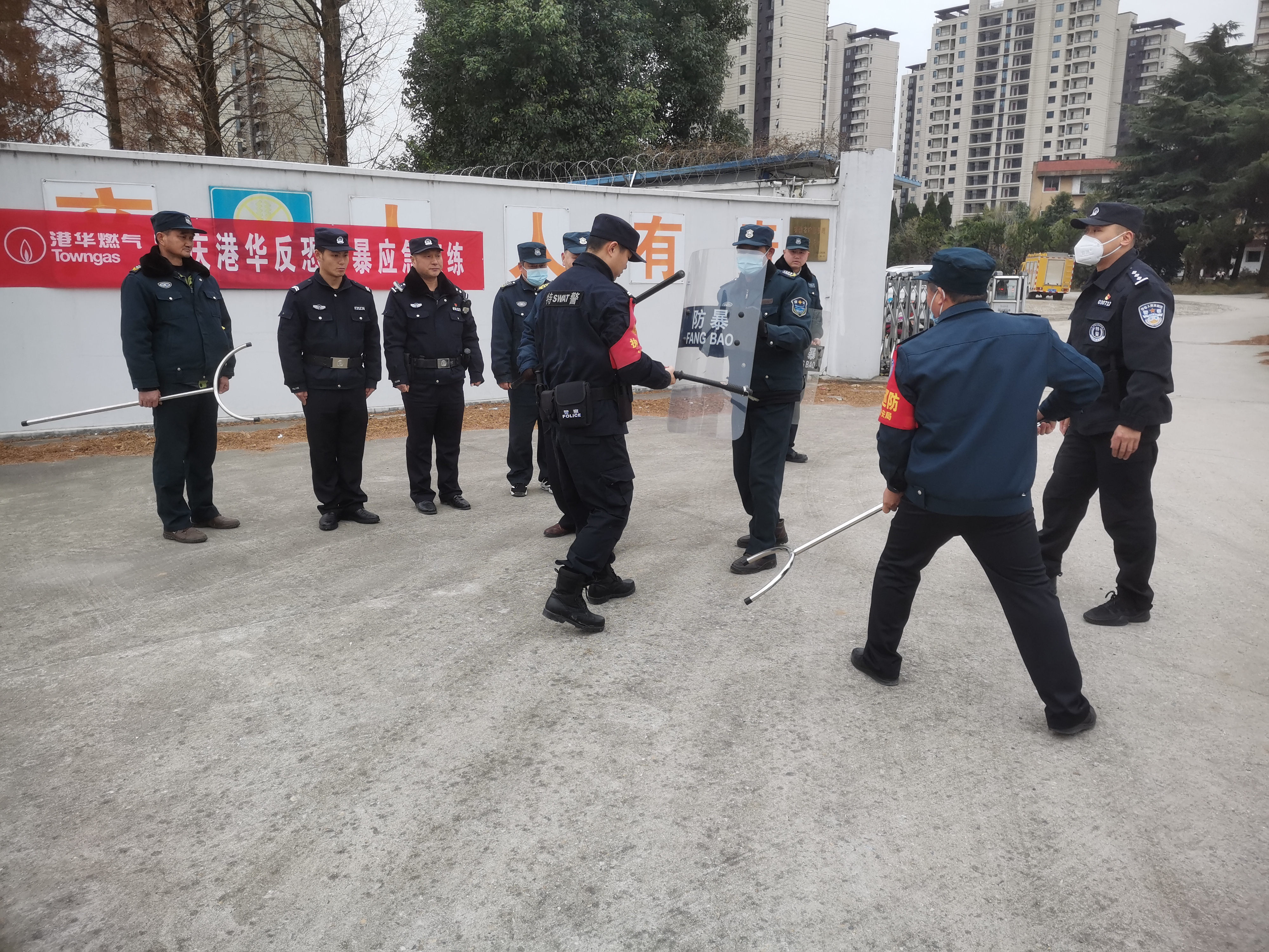 為確保演練效果,分局警官于演練開(kāi)始前,對(duì)港華安保人員進(jìn)行了相關(guān)知識(shí)培訓(xùn),并就防爆器材使用方法進(jìn)行了詳細(xì)講解及實(shí)操演示。此次演練,現(xiàn)場(chǎng)模擬了加氣站發(fā)生一起歹徒持刀威脅加氣工作人員的惡性事件。值班保安發(fā)現(xiàn)嫌疑人員后,立即手持盾牌及警棍上前阻攔,其他人員迅速配合并撥打轄區(qū)民警電話報(bào)警,并由加氣站負(fù)責(zé)人員及時(shí)報(bào)告公司司反恐應(yīng)急小組。隨后,值班保安利用警棍、鋼叉等配合到達(dá)現(xiàn)場(chǎng)的民警將“歹徒”制服,并扭送至轄區(qū)派出所。