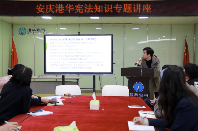 組織20余名員工代表開展憲法專題講座,以《中華人民共和國憲法》《勞動法》《城鎮(zhèn)燃?xì)夤芾項(xiàng)l例》及誠信合規(guī)相關(guān)法律法規(guī)的解讀和案例詳解為主要內(nèi)容,進(jìn)行法律宣講。