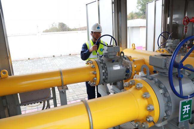 12時08分,置換作業(yè)開始。確定管道內(nèi)氣體成分比例符合要求后,置換組緩慢開啟1號閥門,向管網(wǎng)內(nèi)輸送天然氣,并由調(diào)度中心對管網(wǎng)內(nèi)壓力情況跟進、監(jiān)測。正午時分,驕陽似火,檢測人員們一邊吃著盒飯一邊堅守施工現(xiàn)場觀測數(shù)據(jù)。終于,14時16分,現(xiàn)場調(diào)度的對講機內(nèi)傳來放散塔檢測人員的聲音:“經(jīng)檢測,管網(wǎng)內(nèi)燃氣含量已達99.7%,置換合格。”