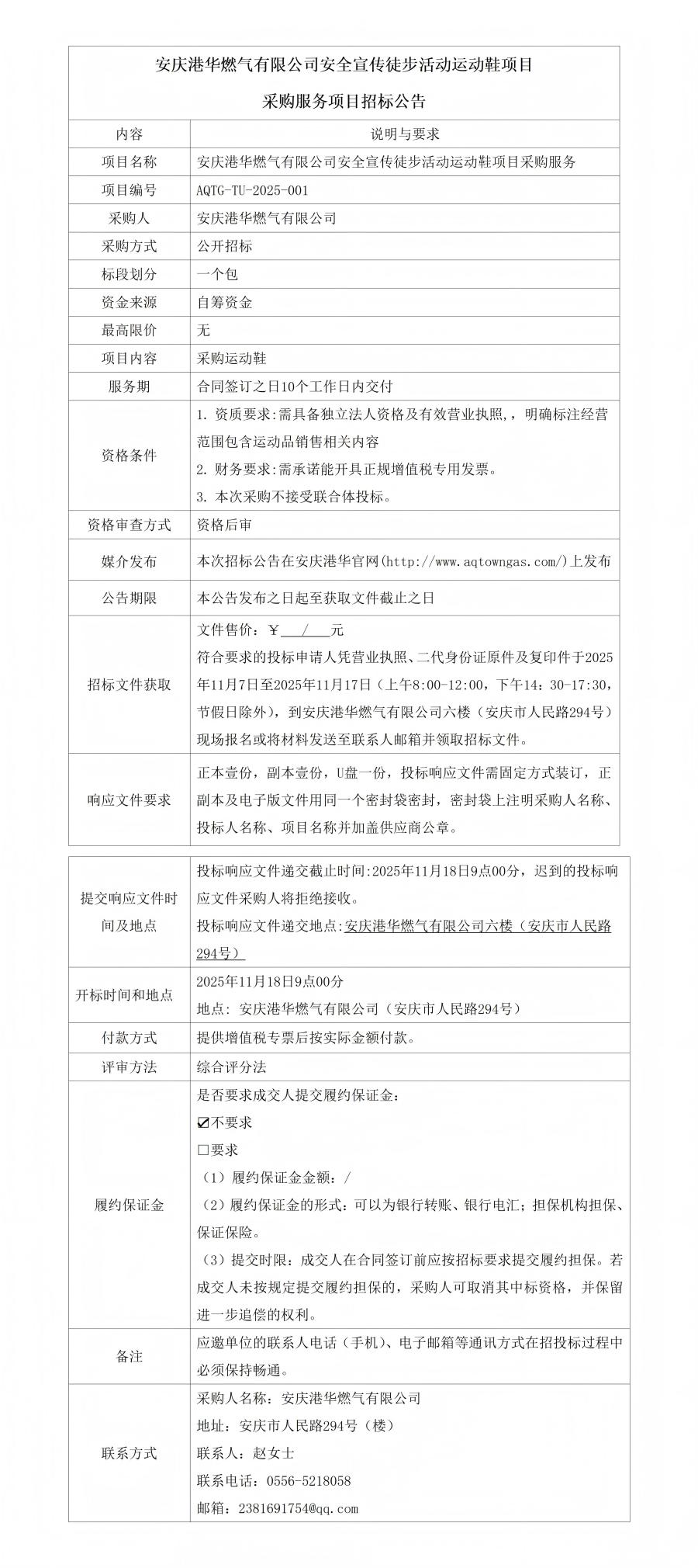 安慶港華燃氣有限公司安全宣傳徒步活動運動鞋項目采購服務(wù)項目招標(biāo)公告