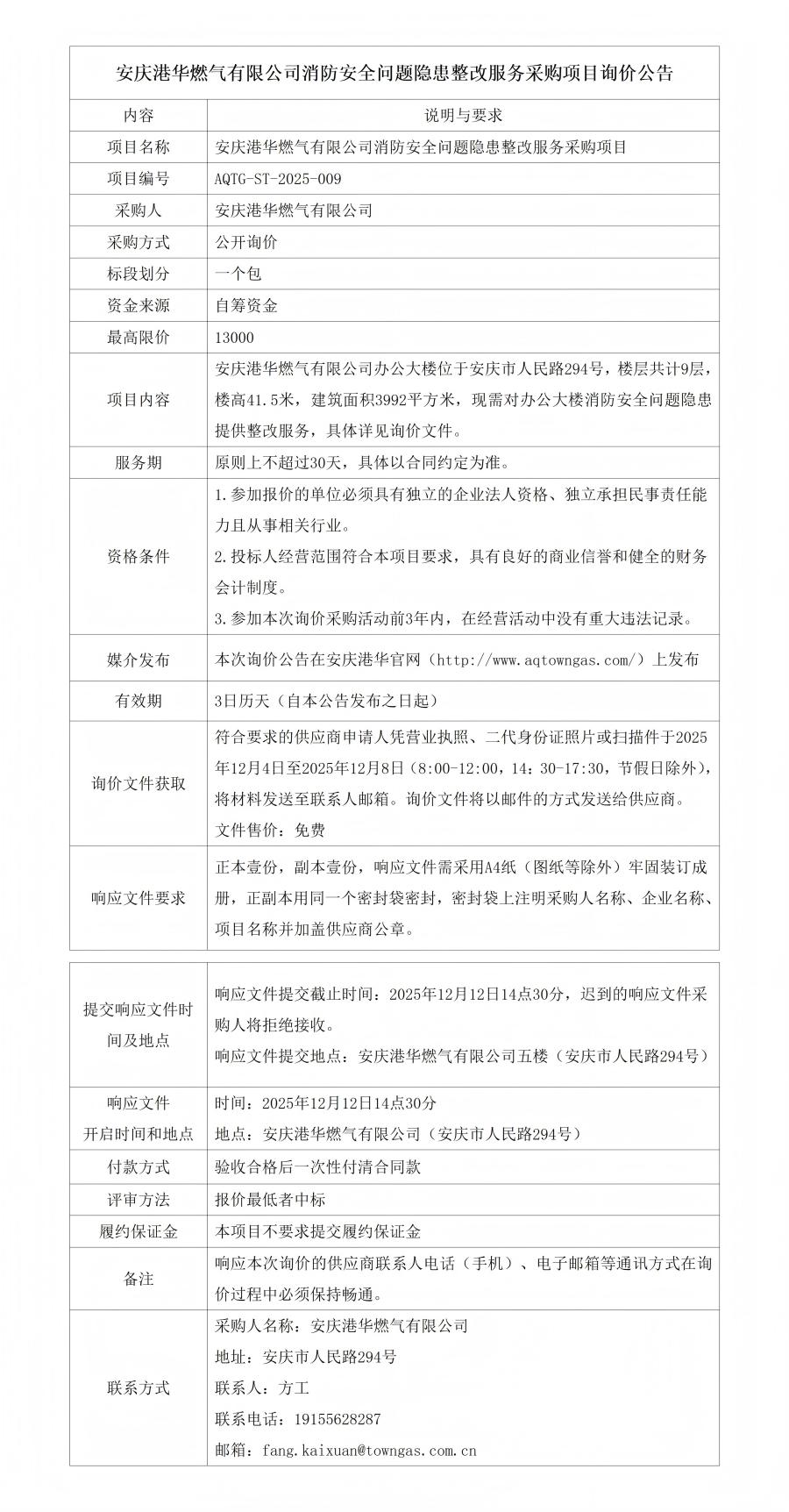 安慶港華燃?xì)庥邢薰鞠腊踩珕栴}隱患整改服務(wù)采購項(xiàng)目詢價公告